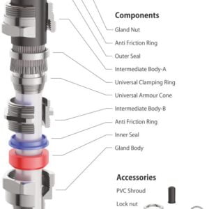 Double compression armoured flameproof (Type “D”) gland for use in explosive atmosphere areas. Ex d, Ex e, Ex t. Suitable for SWA cables.